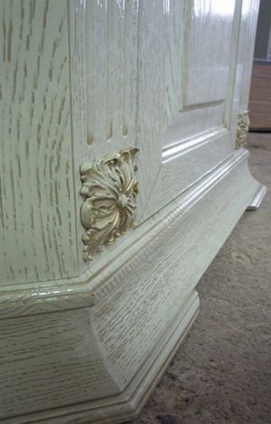 Тумба под тв в гостиную из массива ольхи. Окрашена эмалью “Слоновая кость” с дополнительным нанесением золотой патины.