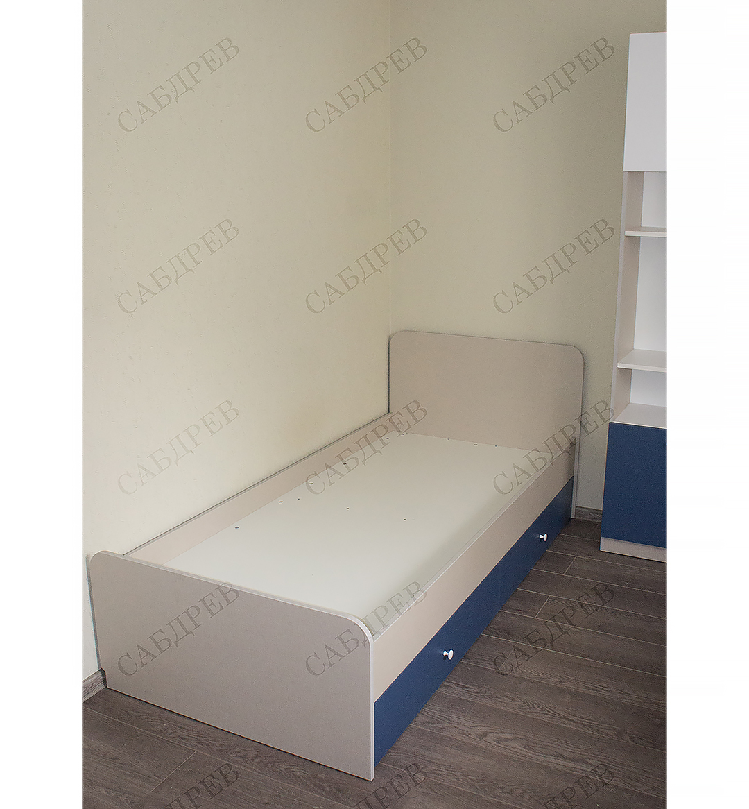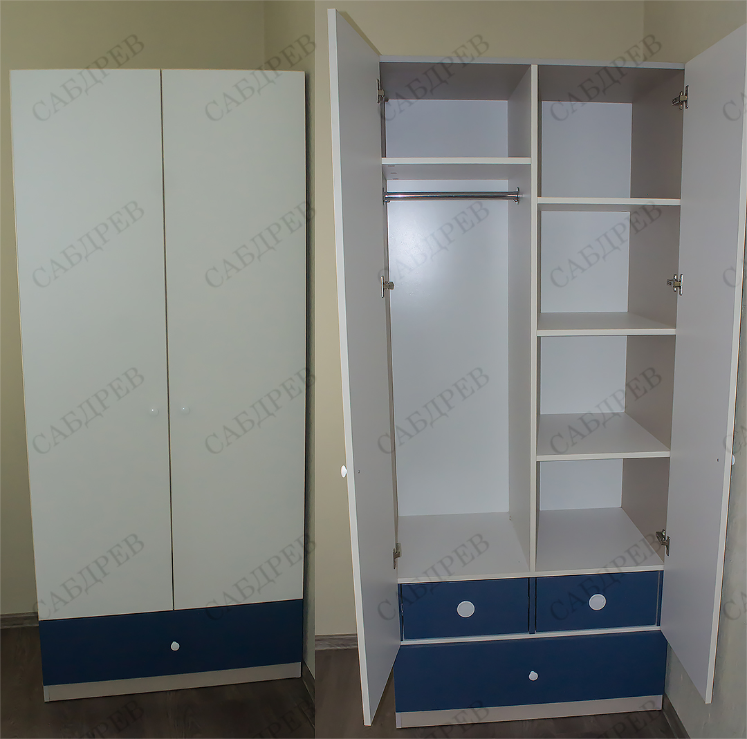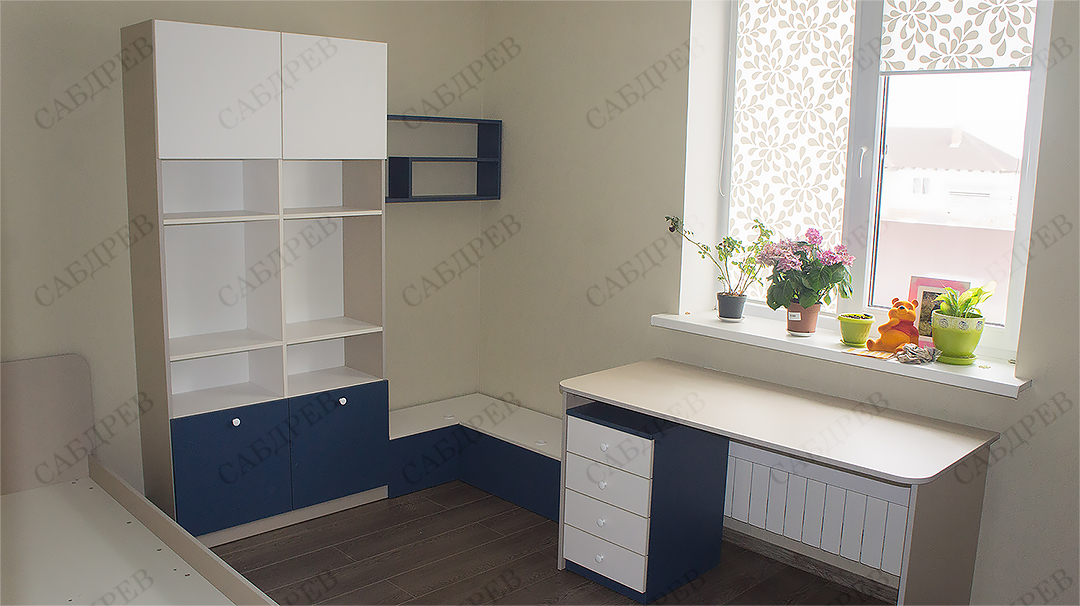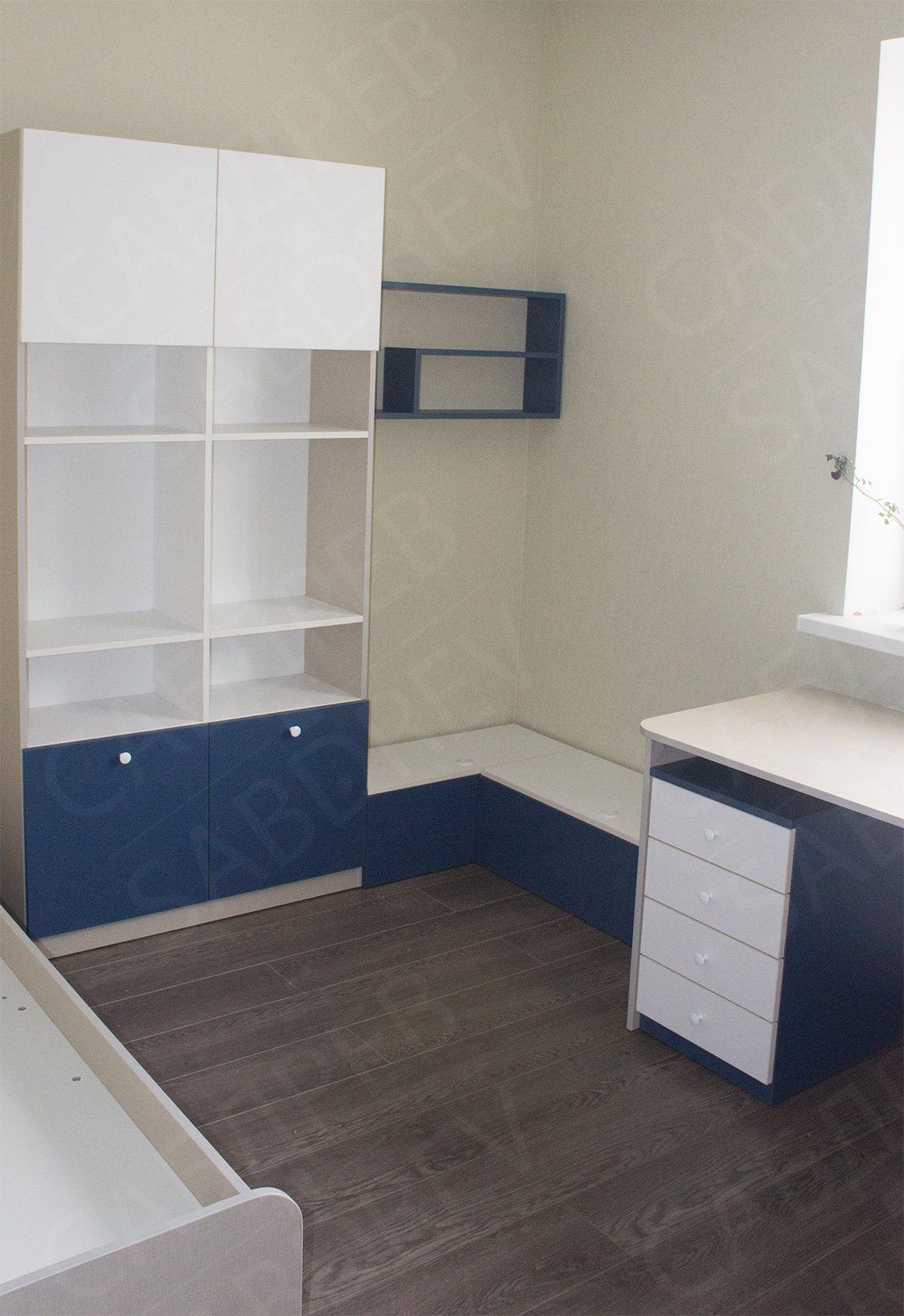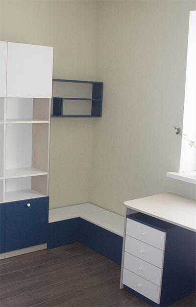 Мебель в детскую изготовлена из ЛДСП Egger (Австрия) с применением двух цветов синего и белого. В заказе использовалась фурнитура GTV (Польша).