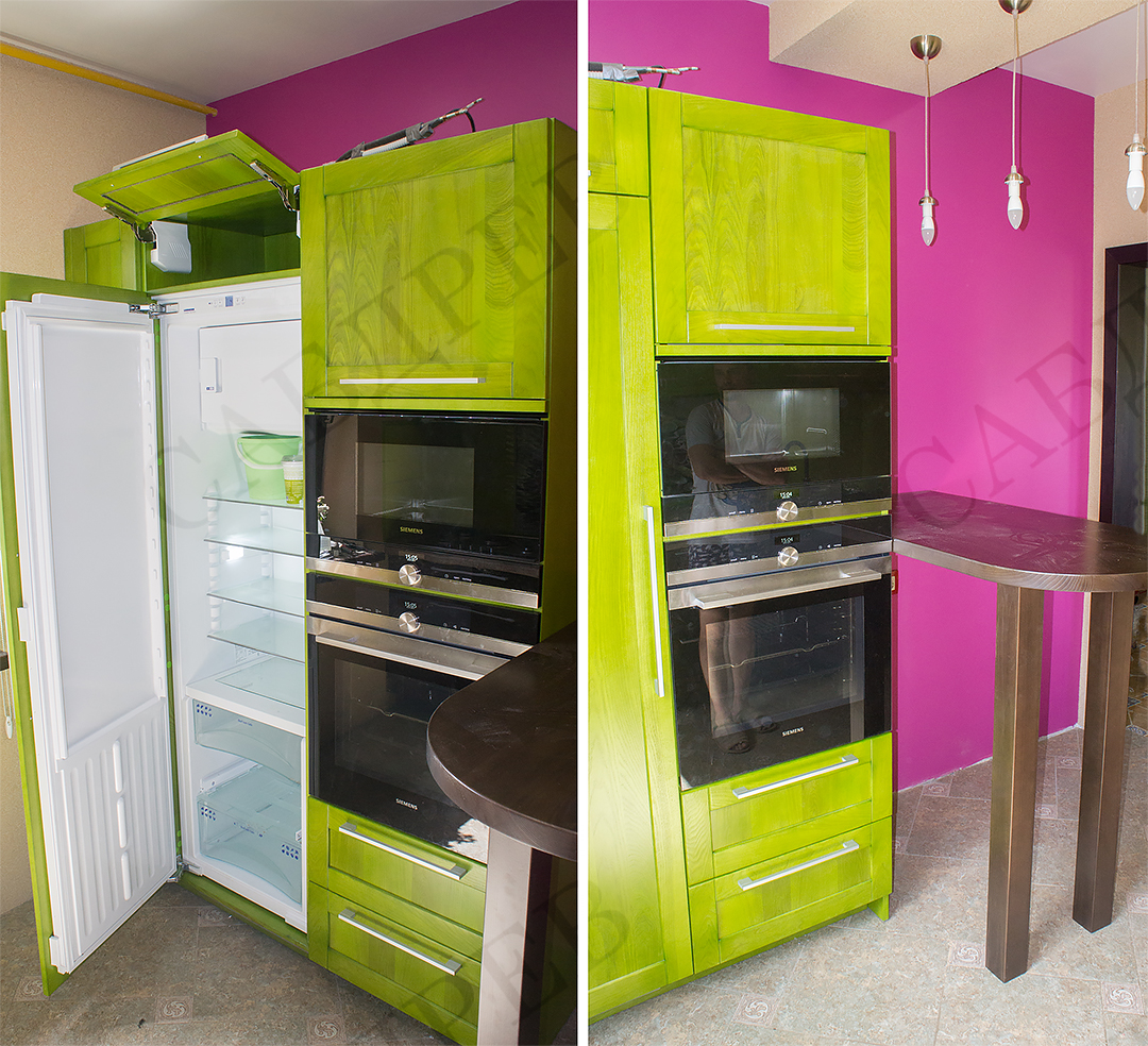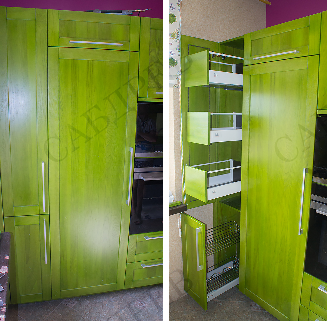 Кухня с фасадами из массива ясеня  по индивидуальному заказу.  В проекте использовалась фурнитура Blum(Австрия).  Окраска красителем  с сохранением текстуры дерева. Также была изготовлена барная стойка из массива ясеня.