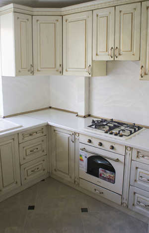 Кухня с фасадами из массива ольхи по индивидуальному заказу. В проекте использовалась фурнитура Blum(Австрия). Окраска белой эмалью с нанесением патины. Столешница из массива дуба.