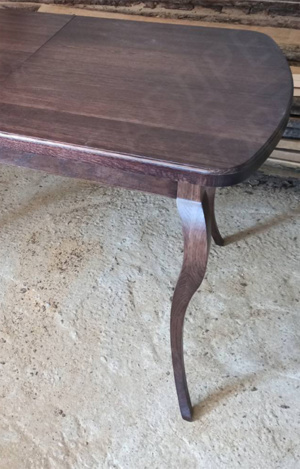 Круглый стол изготовлен из массива дуба. Окраска белой эмалью с сохранением пор дерева с дополнительным нанесением красной патины.