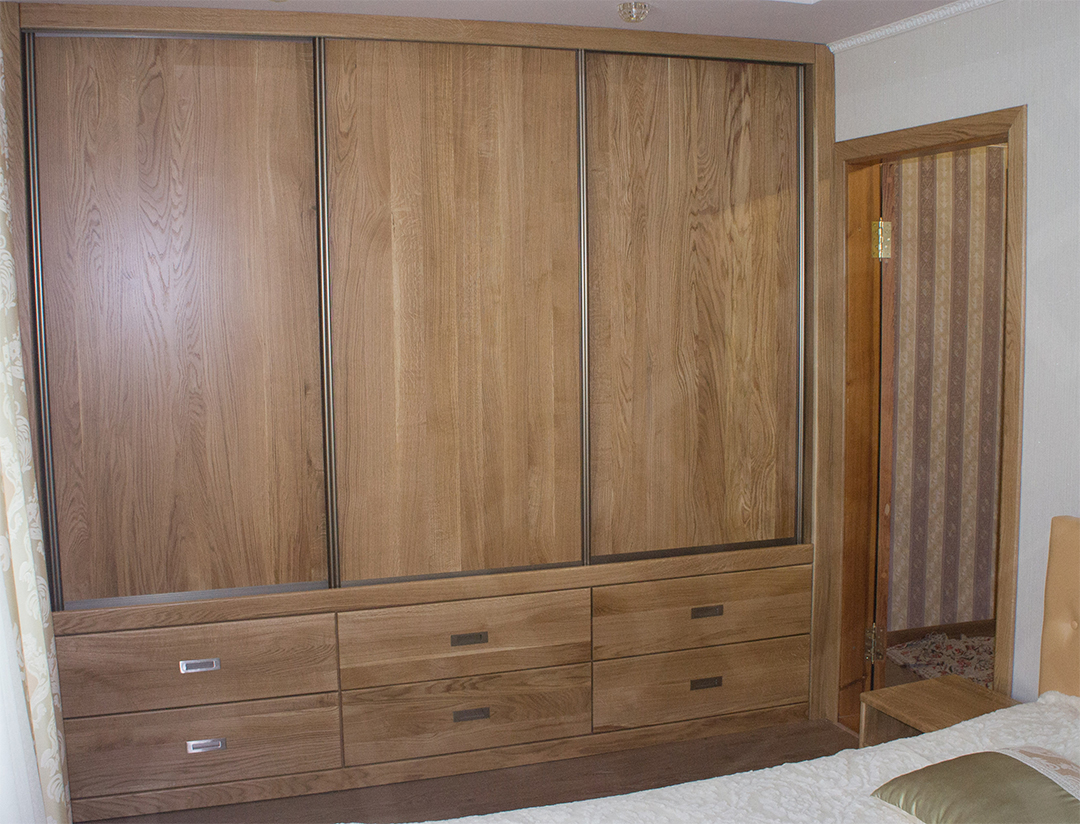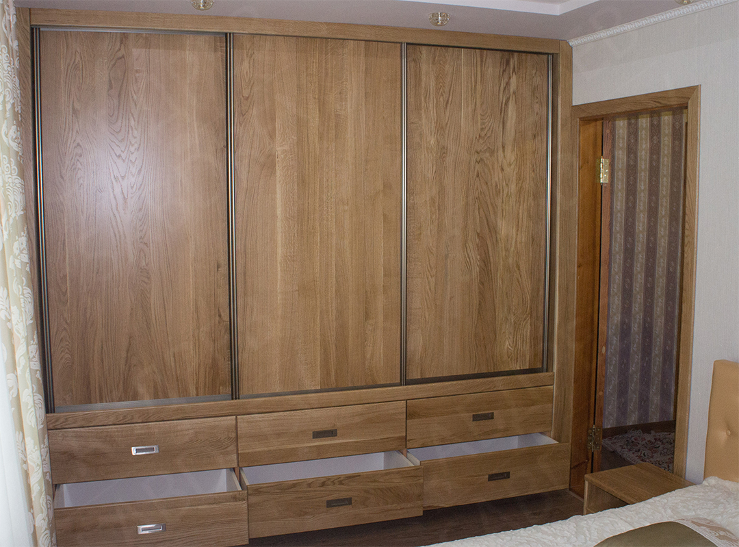 Шкаф купе из массива Дуба. Внутренняя часть корпуса из ЛДСП “Egger” Фасад из алюминиевого профиля Цвета “Шампань” и вставок из массива дуба. Направляющие выдвижных ящиков “Blum”