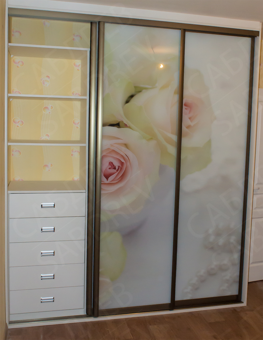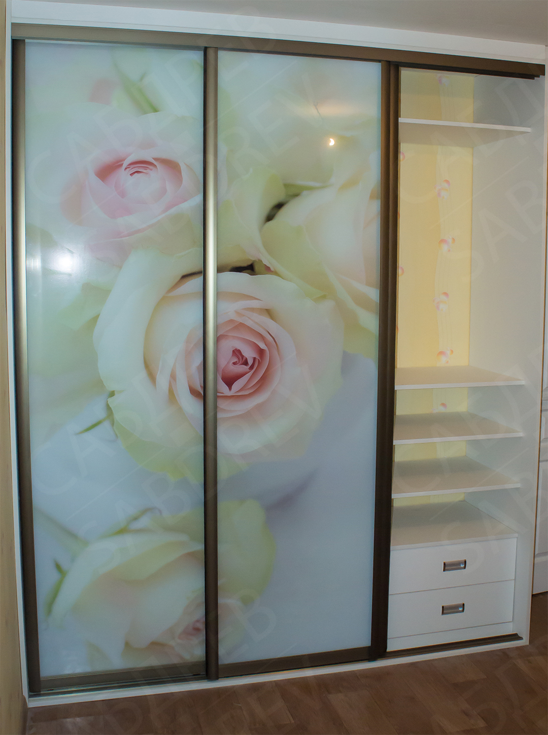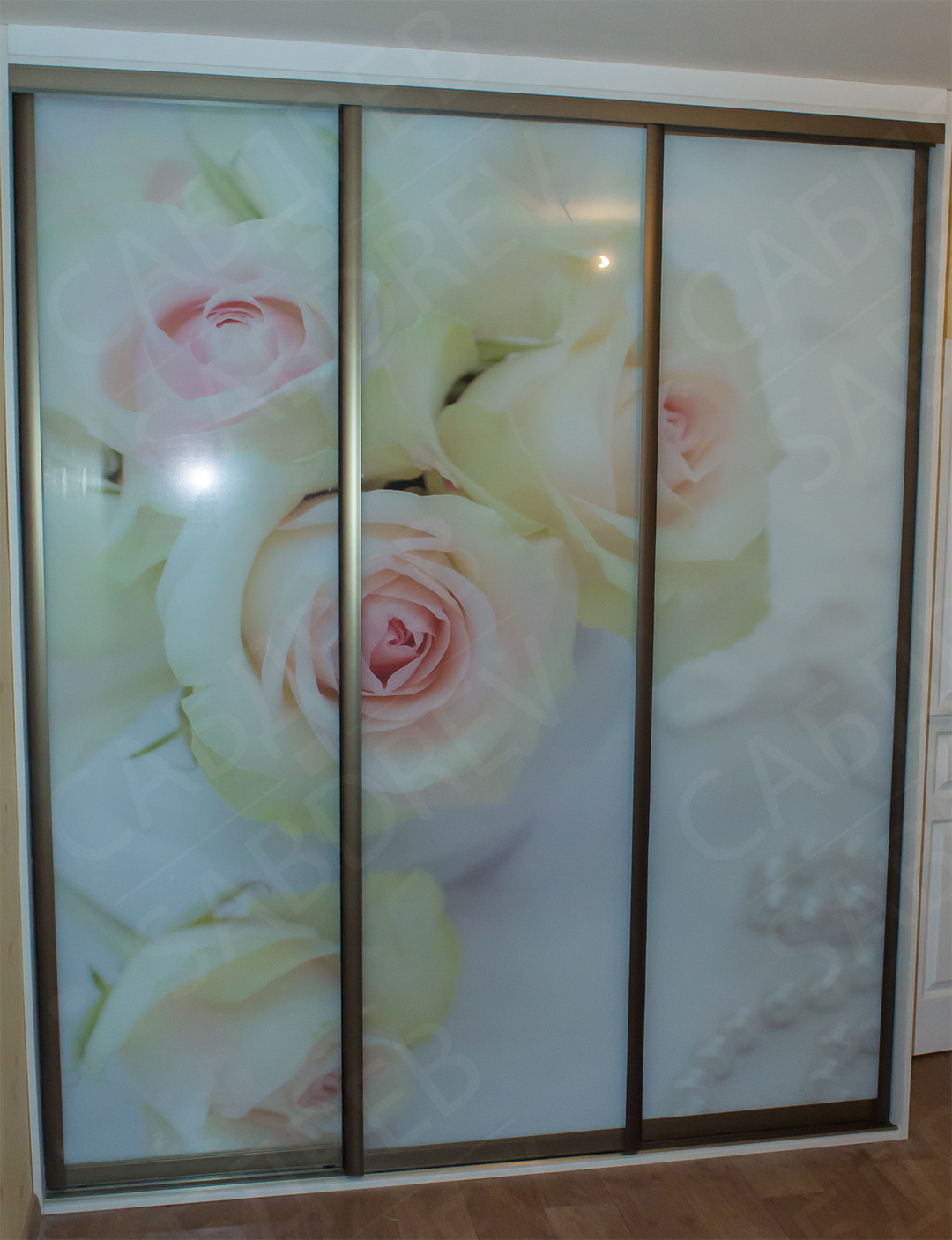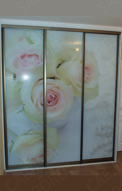Шкаф купе с корпусом из ЛДСП KronoSpan. Фасад из алюминиевого профиля Цвета “Шампань” и стекла с фотопечатью.