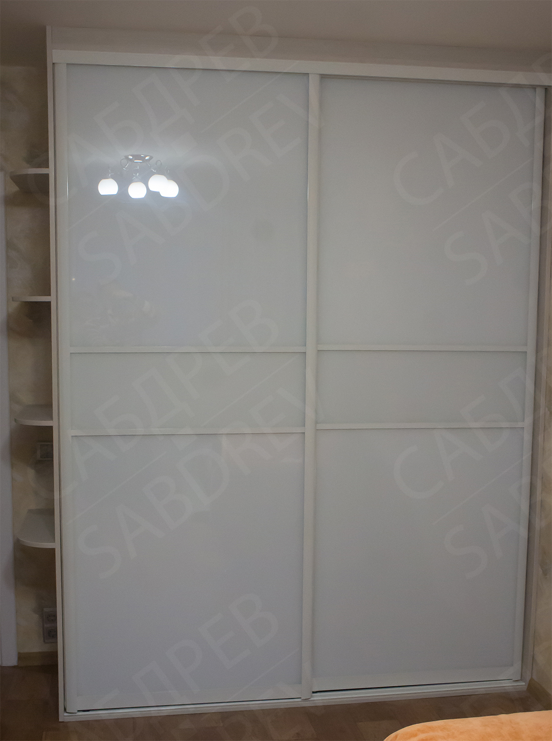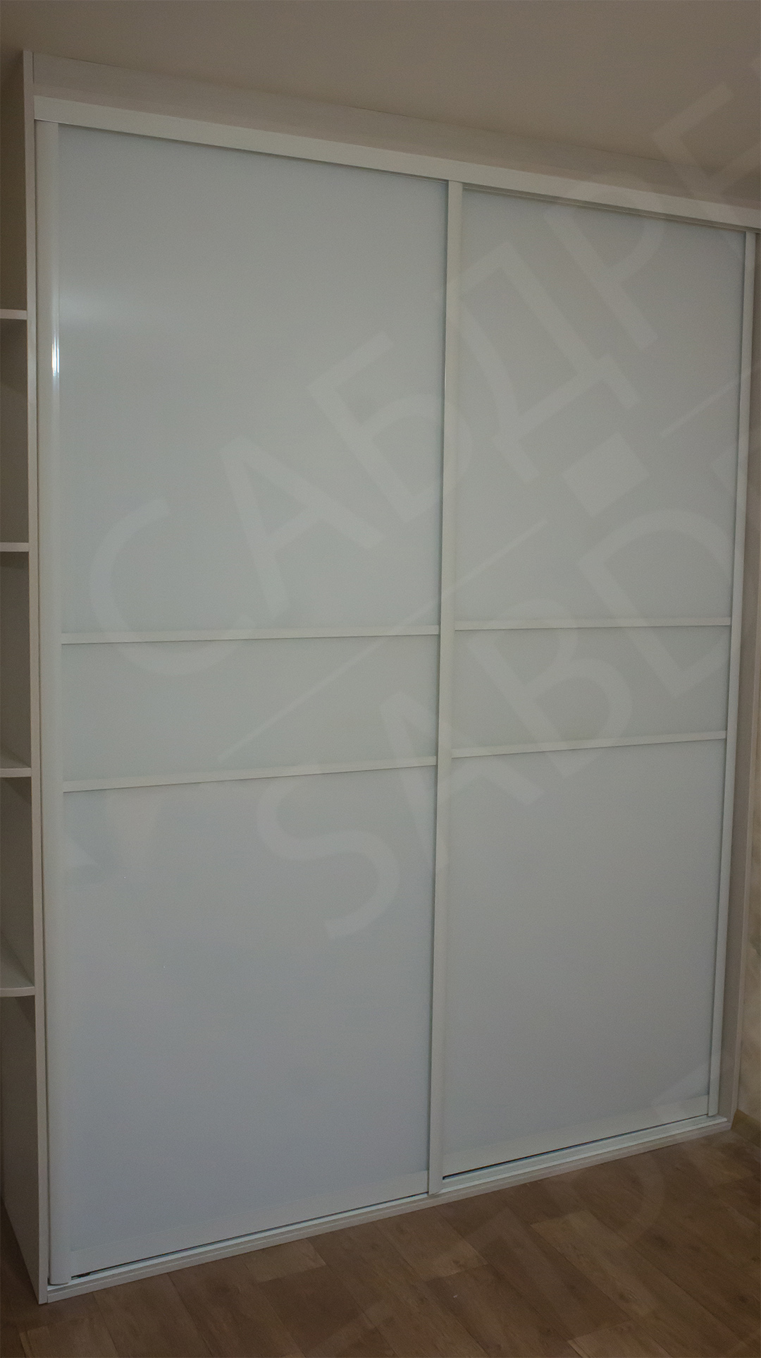 Большой шкаф купе с корпусом из ЛДСП. Фасад из алюминиевого профиля белого цвета и стекла Лакобель “Ультра Белый”