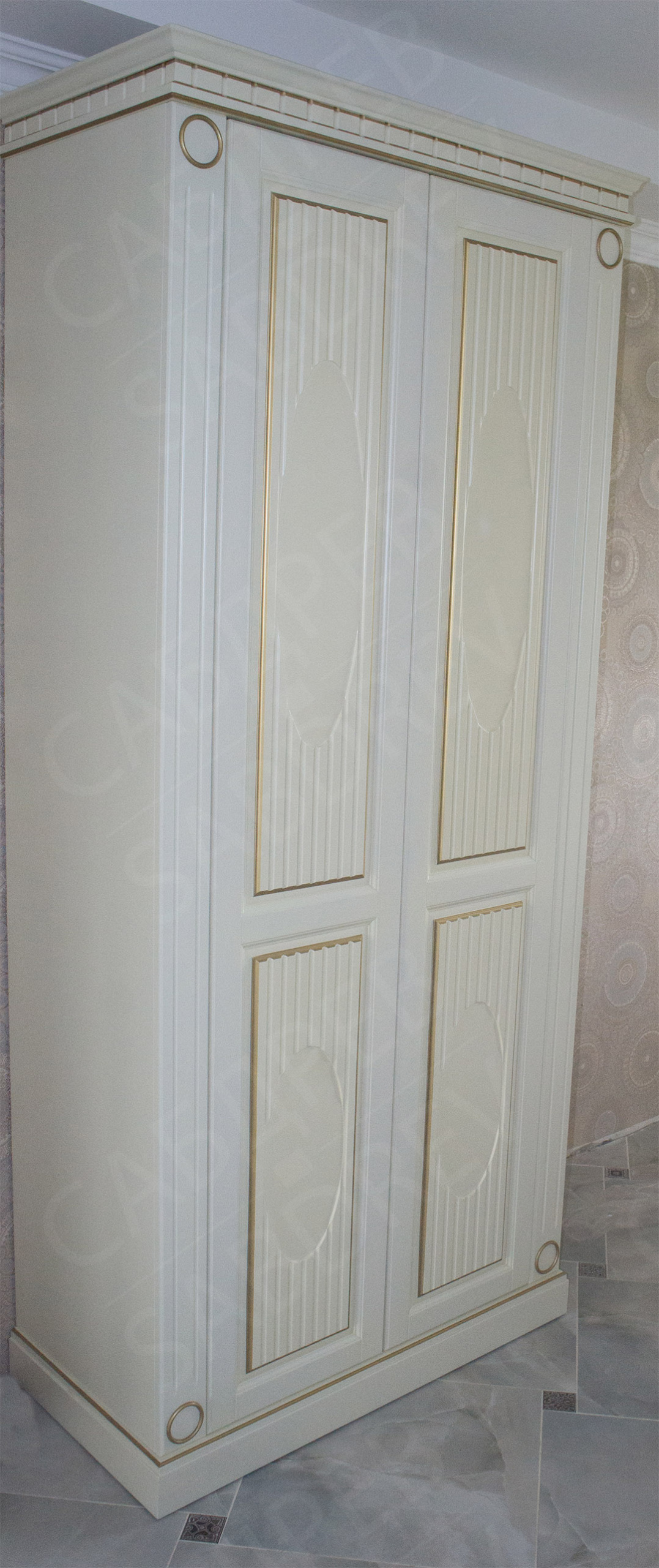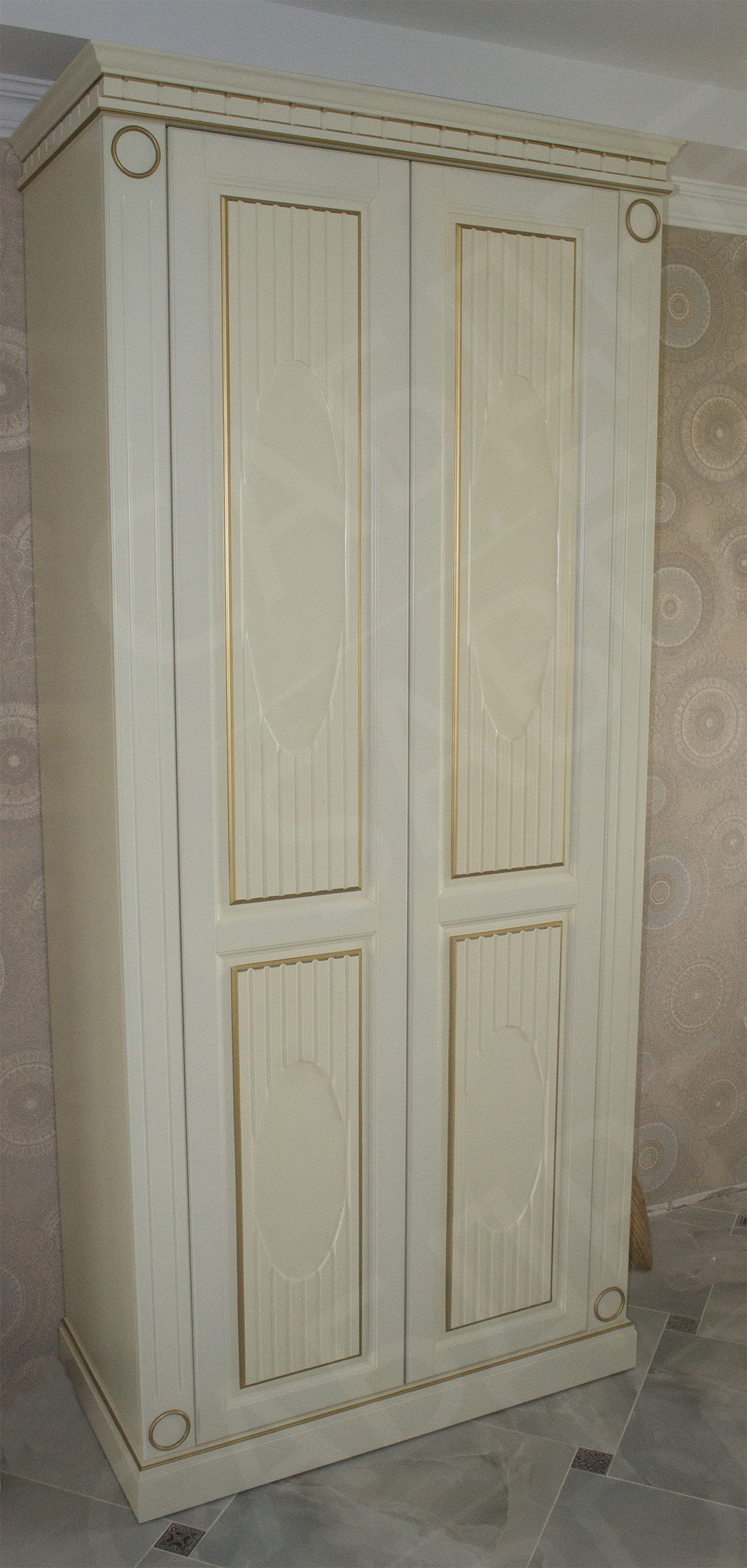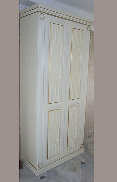 Шкаф с корпусом из МДФ и фасадом из массива ольхи . Фасад окрашен эмалью цвета”Слоновая кость ” c дополнительным нанесением патины “золотого” цвета.
