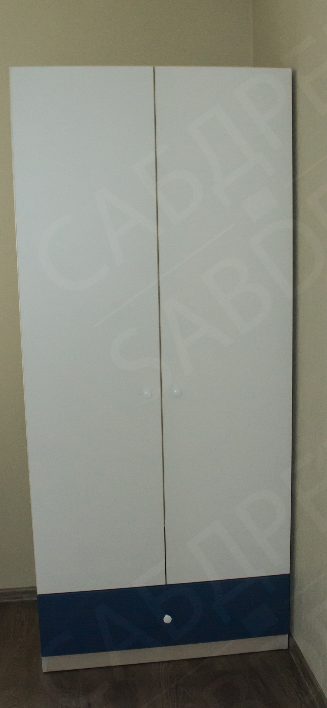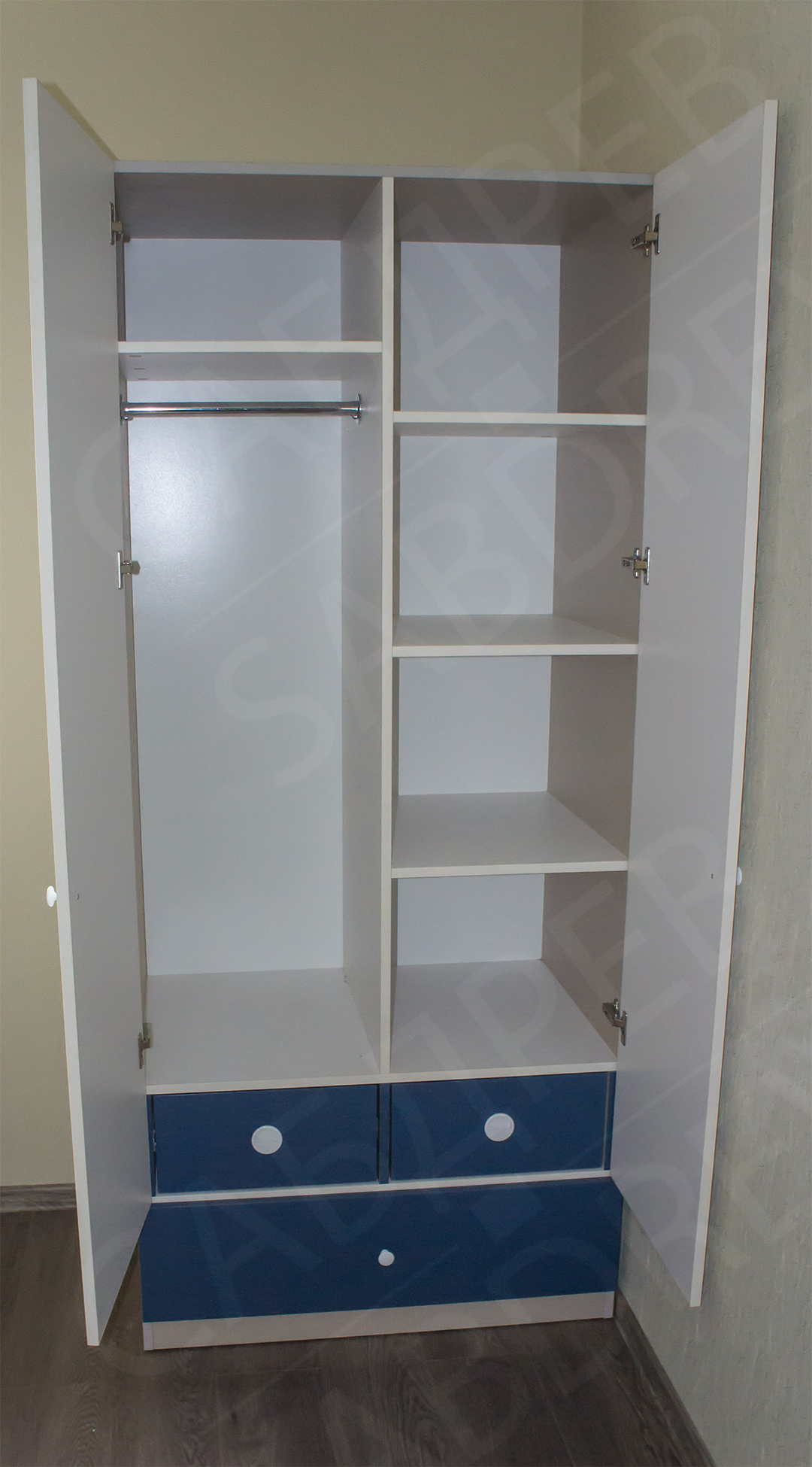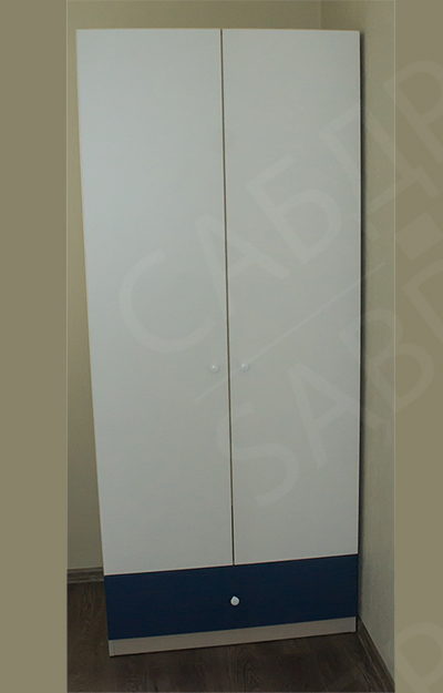 Шкаф в детскую из ЛДСП “Egger” двух цветов с внутренними выдвижными ящиками. Использовалась фурнитура GTV (Польша).
