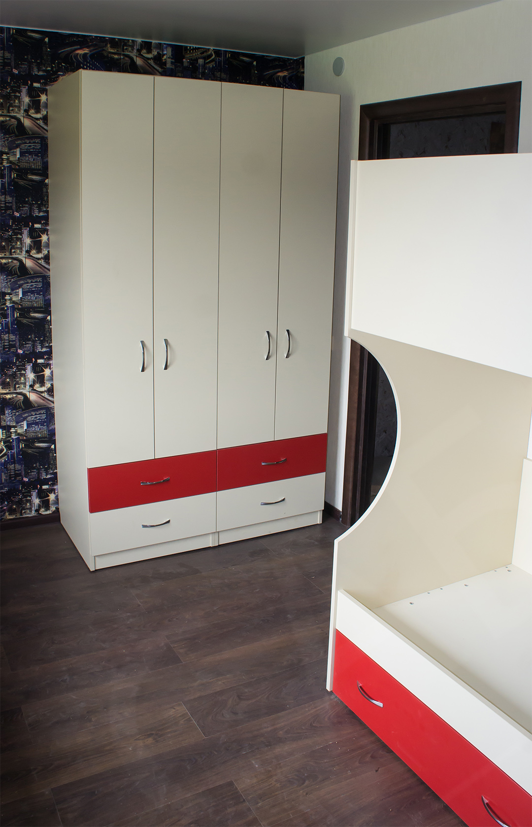 Шкаф в детскую из ЛДСП “Egger” двух цветов с выдвижными ящиками. Использовалась фурнитура GTV (Польша).