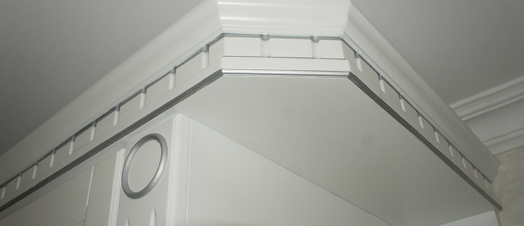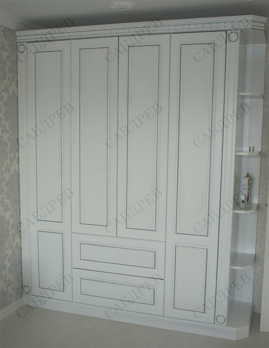 Шкаф из массива ольхи по индивидуальному заказу. Окраска эмалью цвета “Слоновая кость” с нанесением патины цвета “Серебро”.